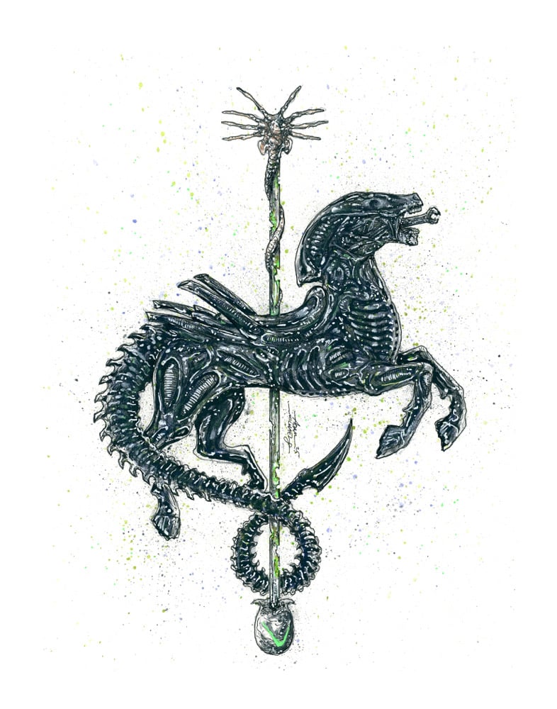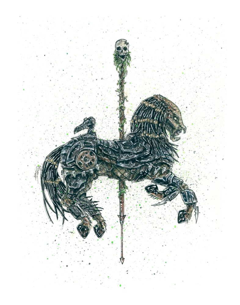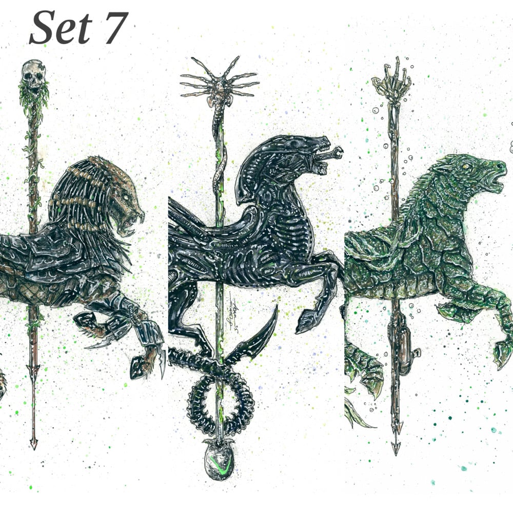 Set 7 - Carousel of Nightmares - Predator / Alien / Creature Horse 9x7 Signed Art Prints